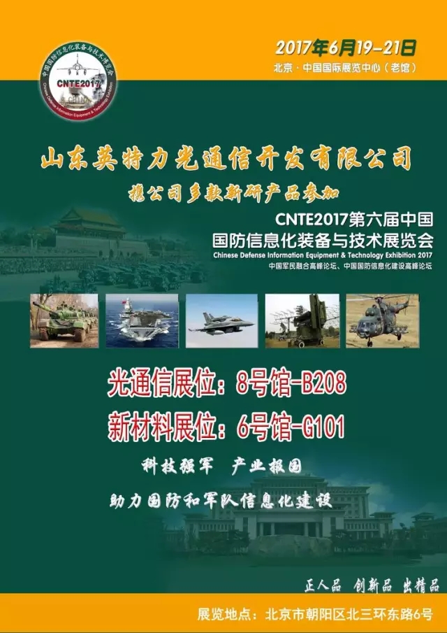 展会介绍作为中国唯一一个以国防信息命名的展会,中国国防信息化装备与技术展览会(国防信息化展),在中央军委联合参谋部、后勤保障部、装备发展部、训练管理部、国防动员部、陆军装备部、海军装备部、空军装备部、火箭军装备部、国家工信部、国家国防科工局及10大军工集团的大力支持下,由全国民营军品企业工作委员会、中国国防科协信息化专业委员会联合主办,由北京企发展览服务有限公司独家承办的“2017第六届中国国防信息化装备与技术展览会(CNTE2017)”将于2017年6月19日-21日在北京.中国国际展览中心六大馆召开。参展产品此次展会,我公司立足“科技强军 产业报国”的企业发展理念,将携带公司多系列新研发的通信产品参加。以满足各参展用户在有线通信、无线通信、卫星通信、IMS融合通信、高性能服务器、新材料产品应用等多个方向的需求。